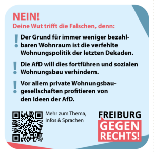 In Freiburg gibt es einen Mangel an bezahlbarem Wohnraum, was vor allem Menschen mit geringem Einkommen betrifft. Die Ideen der AfD werden jedoch nicht zu mehr günstigem Wohnraum in Freiburg führen. Obwohl der Begriff ‚sozialer Wohnungsbau‚ im Freiburger Parteiprogramm auftaucht (1), stimmt die AfD im Bundestag gegen den Ausbau von Sozialwohnungen und setzt stattdessen auf Eigentumsförderung und Deregulierung (2). Dadurch wird der Mietpreis vom profitorientierten Markt bestimmt.